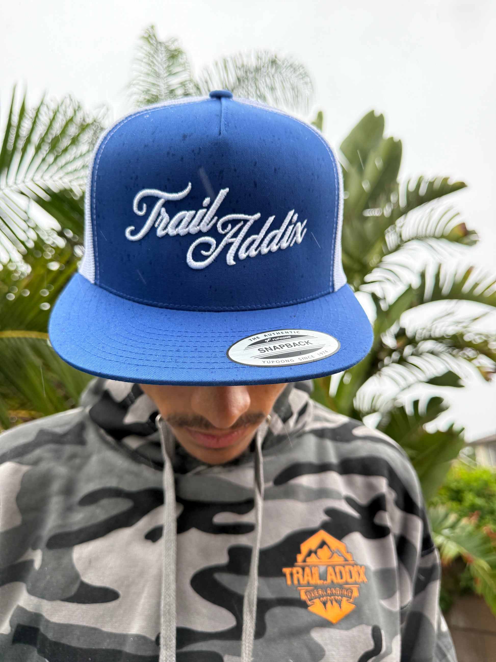 Trail Addix DRIP Hat in Blue.Trail Addix DRIP hat with Trail Addix written in script. Trucker Hat Style Snap Back, Solid in the front and netted in the back.