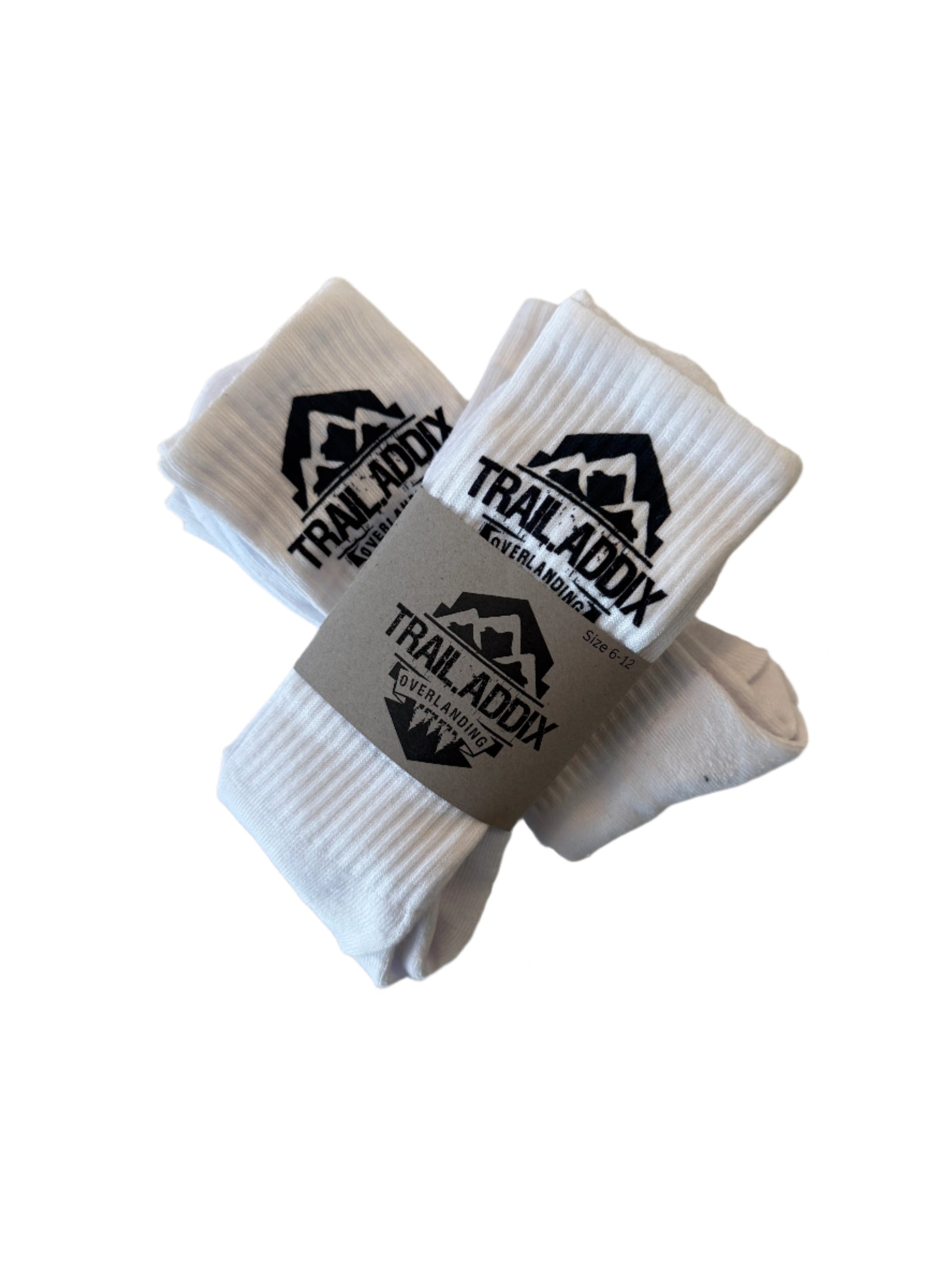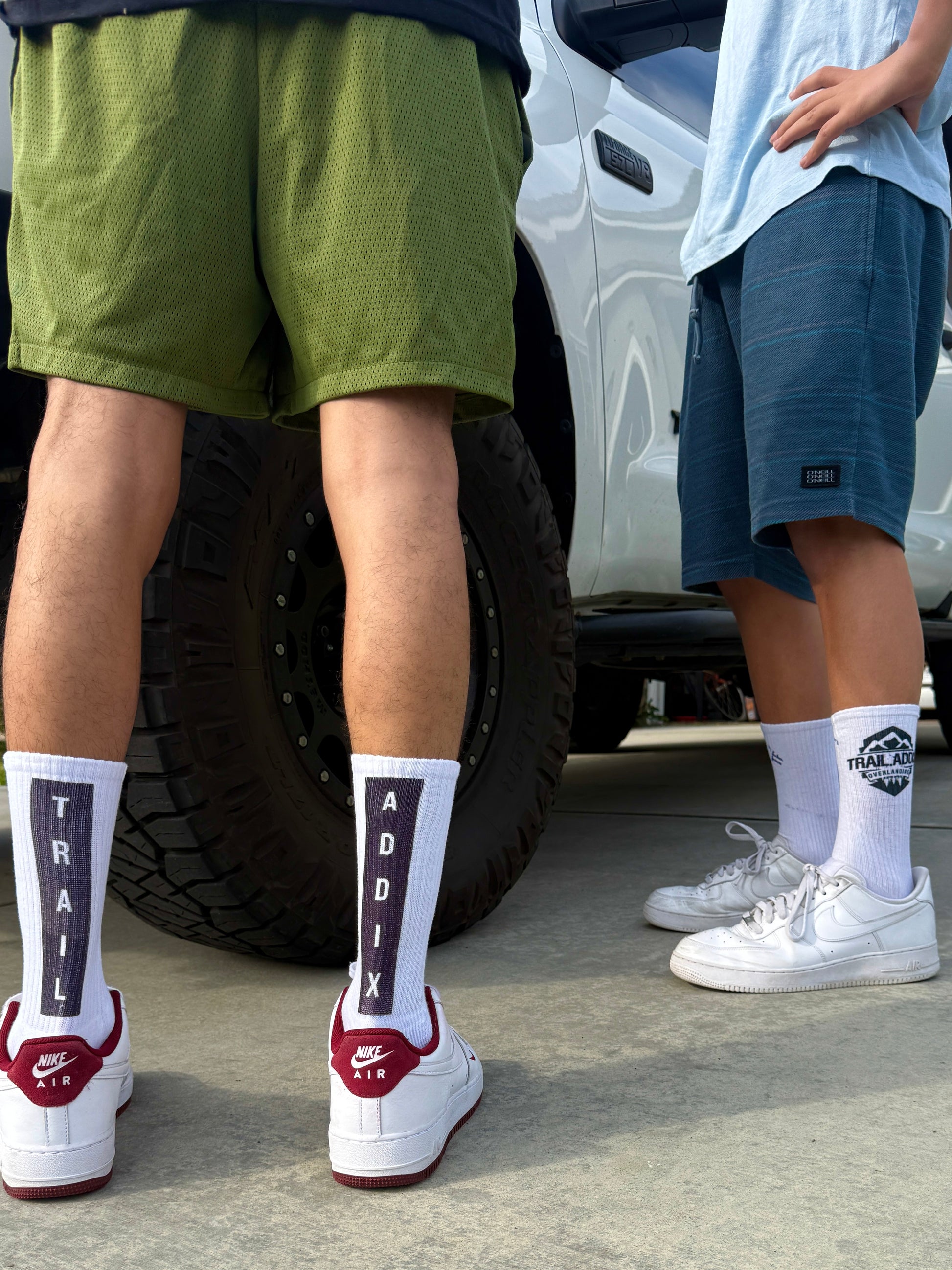 2 pack sock combo. One pair with the words Trail down one sock and Addix down the other. Second pair has the Trail Addix Logo on the on the outside of the ankle.